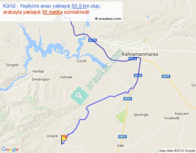 Kürtül - Yeşilyöre arası yaklaşık olarak 90 km/h ile yukarıda belirtilen sürede olup, iki yerin kuş uçuşu uzaklığı (mesafesi) 24'dir. Yolculuk otobüsle 1 saat 12 dakika sürmektedir.
