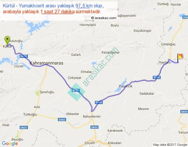 Kürtül - Yumaklıcerit arası yaklaşık olarak 90 km/h ile yukarıda belirtilen sürede olup, iki yerin kuş uçuşu uzaklığı (mesafesi) 70'dir. Yolculuk otobüsle 1 saat 53 dakika sürmektedir.
