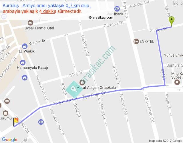 Kurtuluş - Arifiye arası yaklaşık olarak 90 km/h ile yukarıda belirtilen sürede olup, iki yerin kuş uçuşu uzaklığı (mesafesi) 1'dir. Yolculuk otobüsle 5 dakika sürmektedir.