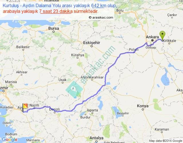Kurtuluş - Aydın Dalama Yolu arası yaklaşık olarak 90 km/h ile yukarıda belirtilen sürede olup, iki yerin kuş uçuşu uzaklığı (mesafesi) 516'dir. Eğer belirtilen yerler arasında uçak seferi var ise bu süre uçakla 47 dakika'ya kadar düşebilir. Yolculuk otobüsle 9 saat 35 dakika sürmektedir.