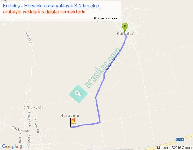 Kurtuluş - Horsunlu arası yaklaşık olarak 90 km/h ile yukarıda belirtilen sürede olup, iki yerin kuş uçuşu uzaklığı (mesafesi) 3'dir. Yolculuk otobüsle 6 dakika sürmektedir.