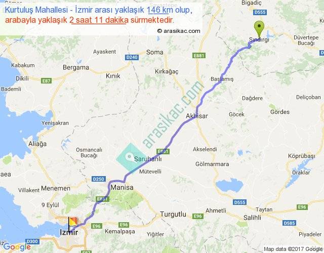 Kurtuluş Mahallesi - İzmir arası yaklaşık olarak 90 km/h ile yukarıda belirtilen sürede olup, iki yerin kuş uçuşu uzaklığı (mesafesi) 127'dir. Yolculuk otobüsle 2 saat 50 dakika sürmektedir.