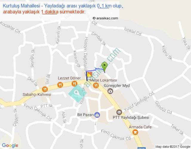 Kurtuluş Mahallesi - Yayladağı arası yaklaşık olarak 90 km/h ile yukarıda belirtilen sürede olup, iki yerin kuş uçuşu uzaklığı (mesafesi) 0'dir. Yolculuk otobüsle 1 dakika sürmektedir.