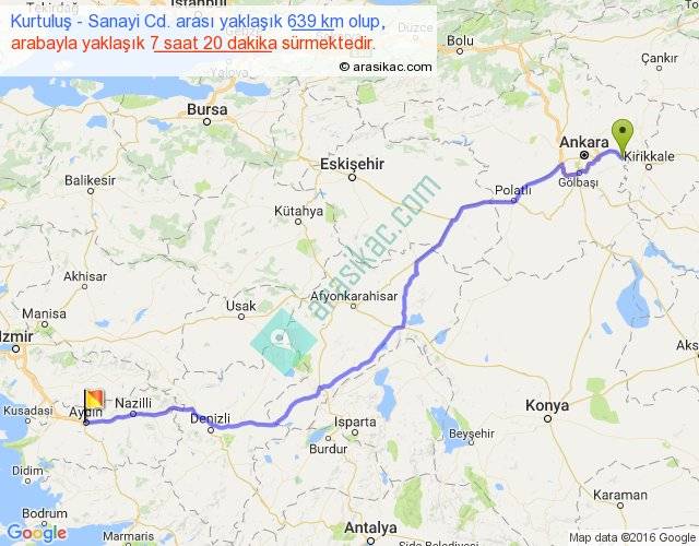 Kurtuluş - Sanayi Cd. arası yaklaşık olarak 90 km/h ile yukarıda belirtilen sürede olup, iki yerin kuş uçuşu uzaklığı (mesafesi) 517'dir. Eğer belirtilen yerler arasında uçak seferi var ise bu süre uçakla 47 dakika'ya kadar düşebilir. Yolculuk otobüsle 9 saat 32 dakika sürmektedir.