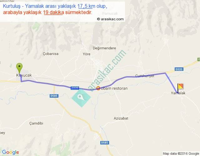 Kurtuluş - Yamalak arası yaklaşık olarak 90 km/h ile yukarıda belirtilen sürede olup, iki yerin kuş uçuşu uzaklığı (mesafesi) 15'dir. Yolculuk otobüsle 24 dakika sürmektedir.