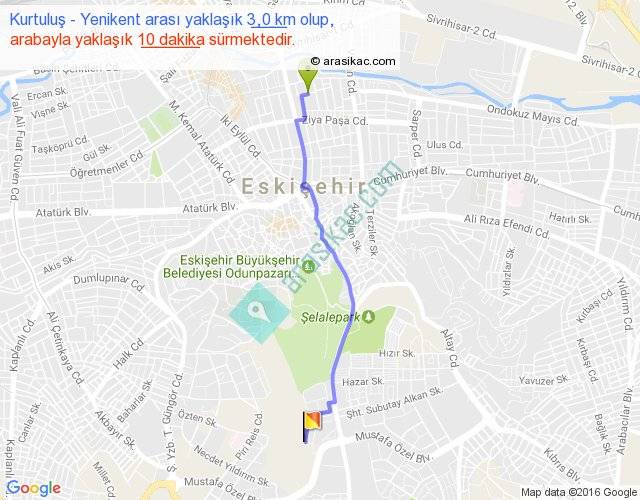 Kurtuluş - Yenikent arası yaklaşık olarak 90 km/h ile yukarıda belirtilen sürede olup, iki yerin kuş uçuşu uzaklığı (mesafesi) 3'dir. Yolculuk otobüsle 13 dakika sürmektedir.