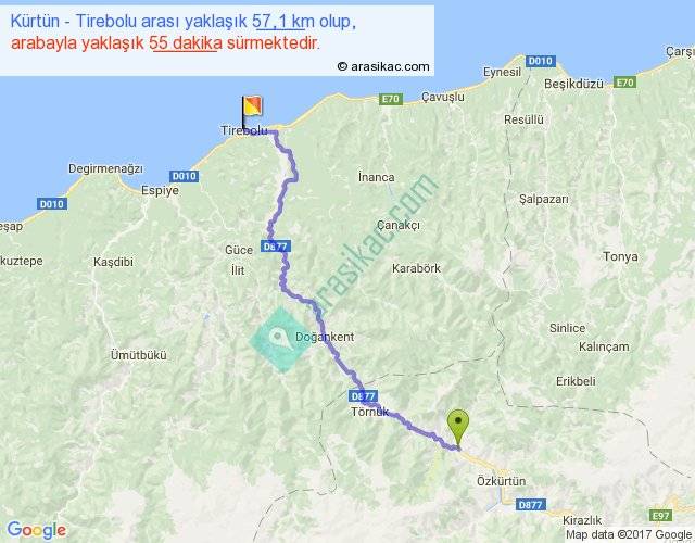 Kürtün - Tirebolu arası yaklaşık olarak 90 km/h ile yukarıda belirtilen sürede olup, iki yerin kuş uçuşu uzaklığı (mesafesi) 41'dir. Yolculuk otobüsle 1 saat 11 dakika sürmektedir.