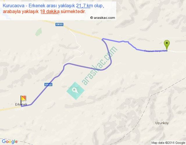 Kurucaova - Erkenek arası yaklaşık olarak 90 km/h ile yukarıda belirtilen sürede olup, iki yerin kuş uçuşu uzaklığı (mesafesi) 16'dir. Yolculuk otobüsle 23 dakika sürmektedir.