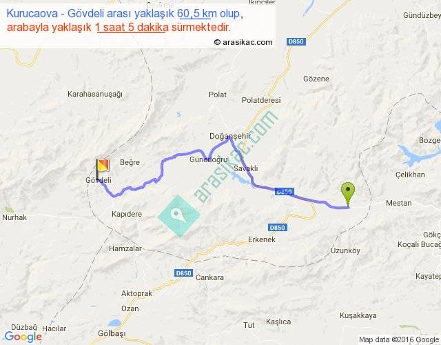 Kurucaova - Gövdeli arası yaklaşık olarak 90 km/h ile yukarıda belirtilen sürede olup, iki yerin kuş uçuşu uzaklığı (mesafesi) 44'dir. Yolculuk otobüsle 1 saat 24 dakika sürmektedir.