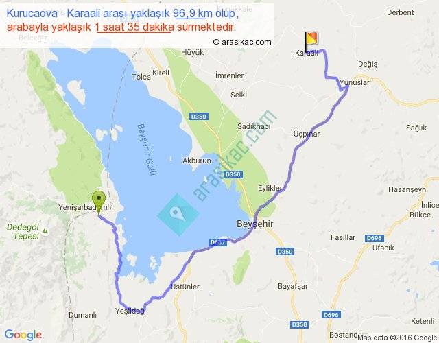 Kurucaova - Karaali arası yaklaşık olarak 90 km/h ile yukarıda belirtilen sürede olup, iki yerin kuş uçuşu uzaklığı (mesafesi) 46'dir. Yolculuk otobüsle 2 saat 3 dakika sürmektedir.