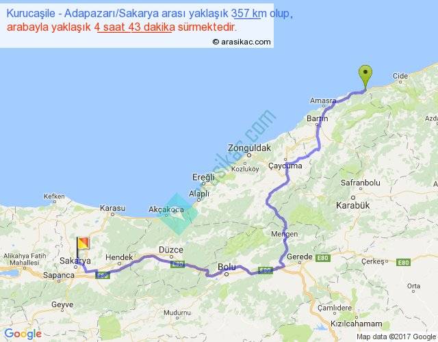 Kurucaşile - Adapazarı Sakarya arası yaklaşık olarak 90 km/h ile yukarıda belirtilen sürede olup, iki yerin kuş uçuşu uzaklığı (mesafesi) 222'dir. Yolculuk otobüsle 6 saat 7 dakika sürmektedir.