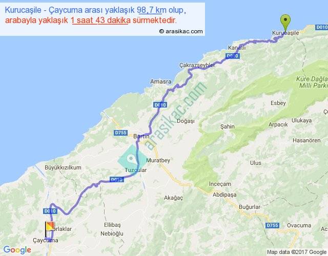 Kurucaşile - Çaycuma arası yaklaşık olarak 90 km/h ile yukarıda belirtilen sürede olup, iki yerin kuş uçuşu uzaklığı (mesafesi) 70'dir. Yolculuk otobüsle 2 saat 13 dakika sürmektedir.