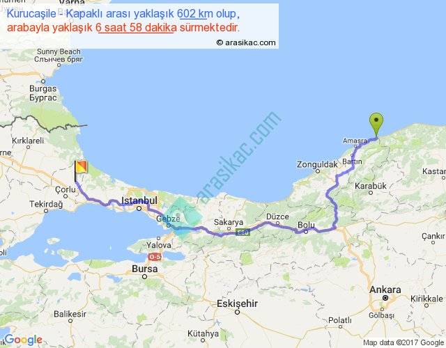 Kurucaşile - Kapaklı arası yaklaşık olarak 90 km/h ile yukarıda belirtilen sürede olup, iki yerin kuş uçuşu uzaklığı (mesafesi) 396'dir. Eğer belirtilen yerler arasında uçak seferi var ise bu süre uçakla 36 dakika'ya kadar düşebilir. Yolculuk otobüsle 9 saat 3 dakika sürmektedir.