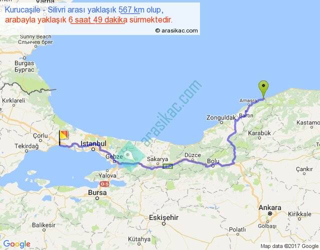 Kurucaşile - Silivri arası yaklaşık olarak 90 km/h ile yukarıda belirtilen sürede olup, iki yerin kuş uçuşu uzaklığı (mesafesi) 380'dir. Eğer belirtilen yerler arasında uçak seferi var ise bu süre uçakla 35 dakika'ya kadar düşebilir. Yolculuk otobüsle 8 saat 51 dakika sürmektedir.