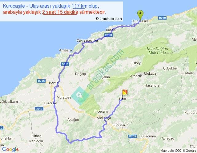 Kurucaşile - Ulus arası yaklaşık olarak 90 km/h ile yukarıda belirtilen sürede olup, iki yerin kuş uçuşu uzaklığı (mesafesi) 30'dir. Yolculuk otobüsle 2 saat 55 dakika sürmektedir.