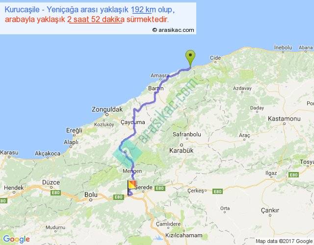 Kurucaşile - Yeniçağa arası yaklaşık olarak 90 km/h ile yukarıda belirtilen sürede olup, iki yerin kuş uçuşu uzaklığı (mesafesi) 132'dir. Yolculuk otobüsle 3 saat 43 dakika sürmektedir.