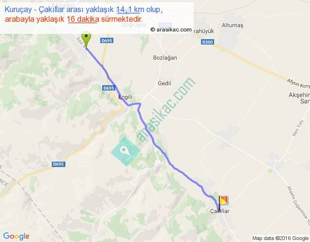 Kuruçay - Çakıllar arası yaklaşık olarak 90 km/h ile yukarıda belirtilen sürede olup, iki yerin kuş uçuşu uzaklığı (mesafesi) 13'dir. Yolculuk otobüsle 20 dakika sürmektedir.