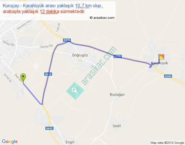 Kuruçay - Karahüyük arası yaklaşık olarak 90 km/h ile yukarıda belirtilen sürede olup, iki yerin kuş uçuşu uzaklığı (mesafesi) 7'dir. Yolculuk otobüsle 15 dakika sürmektedir.