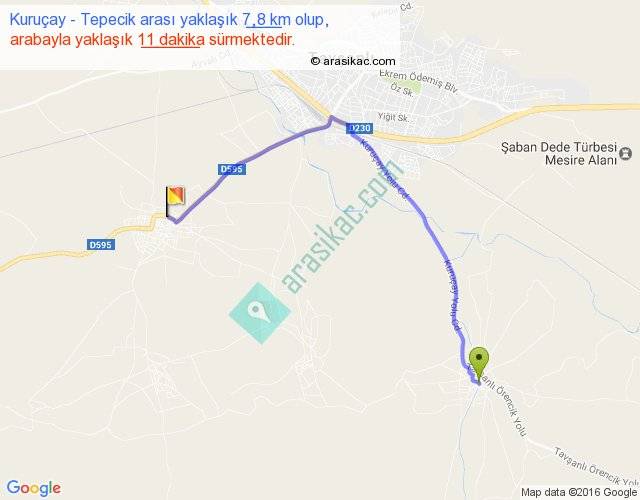Kuruçay - Tepecik arası yaklaşık olarak 90 km/h ile yukarıda belirtilen sürede olup, iki yerin kuş uçuşu uzaklığı (mesafesi) 5'dir. Yolculuk otobüsle 14 dakika sürmektedir.