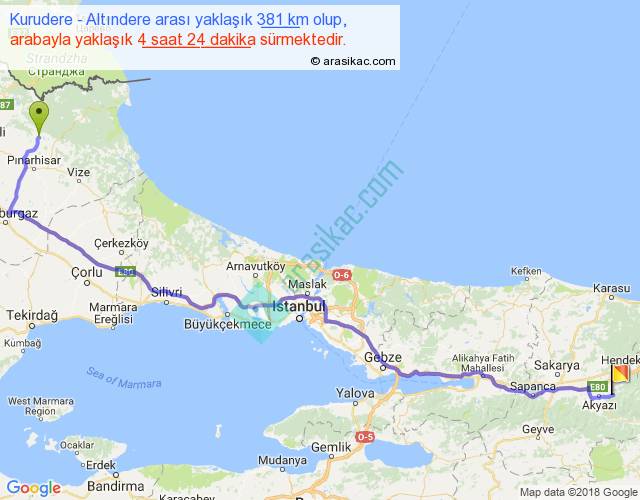Kurudere - Altındere arası yaklaşık olarak 90 km/h ile yukarıda belirtilen sürede olup, iki yerin kuş uçuşu uzaklığı (mesafesi) 287'dir. Eğer belirtilen yerler arasında uçak seferi var ise bu süre uçakla 26 dakika'ya kadar düşebilir. Yolculuk otobüsle 5 saat 43 dakika sürmektedir.