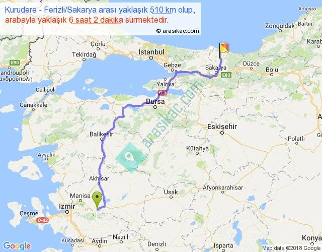 Kurudere - Ferizli Sakarya arası yaklaşık olarak 90 km/h ile yukarıda belirtilen sürede olup, iki yerin kuş uçuşu uzaklığı (mesafesi) 361'dir. Eğer belirtilen yerler arasında uçak seferi var ise bu süre uçakla 33 dakika'ya kadar düşebilir. Yolculuk otobüsle 7 saat 50 dakika sürmektedir.