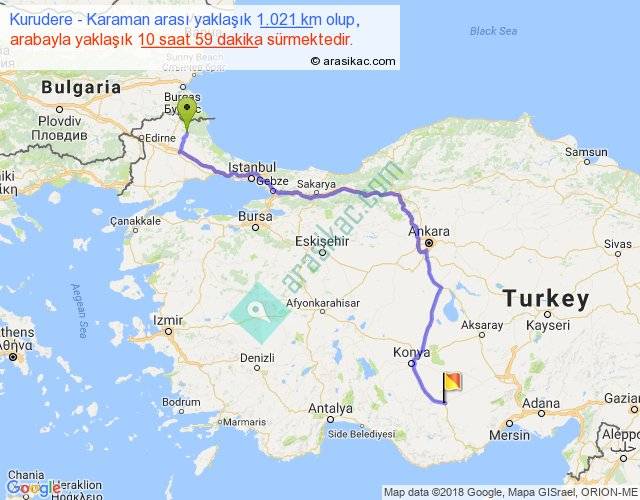 Kurudere - Karaman arası yaklaşık olarak 90 km/h ile yukarıda belirtilen sürede olup, iki yerin kuş uçuşu uzaklığı (mesafesi) 700'dir. Eğer belirtilen yerler arasında uçak seferi var ise bu süre uçakla 1 saat 04 dakika'ya kadar düşebilir. Yolculuk otobüsle 14 saat 16 dakika sürmektedir.