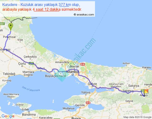Kurudere - Kuzuluk arası yaklaşık olarak 90 km/h ile yukarıda belirtilen sürede olup, iki yerin kuş uçuşu uzaklığı (mesafesi) 286'dir. Eğer belirtilen yerler arasında uçak seferi var ise bu süre uçakla 26 dakika'ya kadar düşebilir. Yolculuk otobüsle 5 saat 27 dakika sürmektedir.