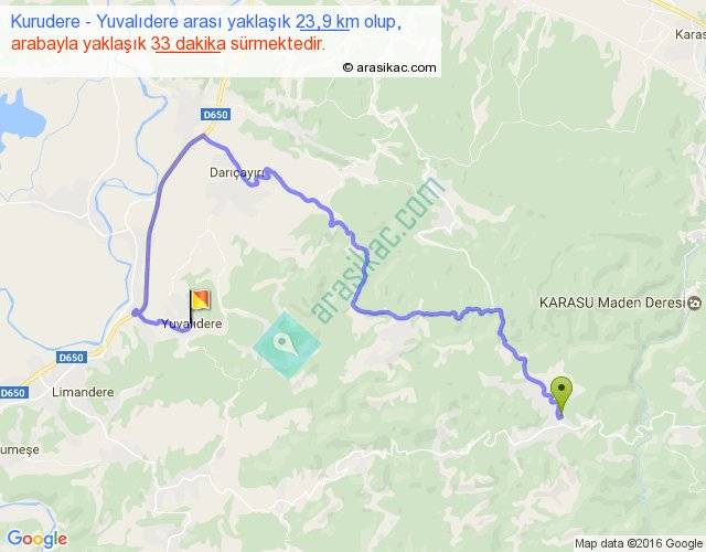 Kurudere - Yuvalıdere arası yaklaşık olarak 90 km/h ile yukarıda belirtilen sürede olup, iki yerin kuş uçuşu uzaklığı (mesafesi) 10'dir. Yolculuk otobüsle 42 dakika sürmektedir.