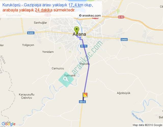 Kuruköprü - Gazipaşa arası yaklaşık olarak 90 km/h ile yukarıda belirtilen sürede olup, iki yerin kuş uçuşu uzaklığı (mesafesi) 16'dir. Yolculuk otobüsle 31 dakika sürmektedir.