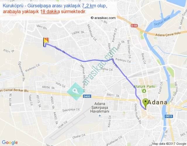 Kuruköprü - Gürselpaşa arası yaklaşık olarak 90 km/h ile yukarıda belirtilen sürede olup, iki yerin kuş uçuşu uzaklığı (mesafesi) 6'dir. Yolculuk otobüsle 23 dakika sürmektedir.