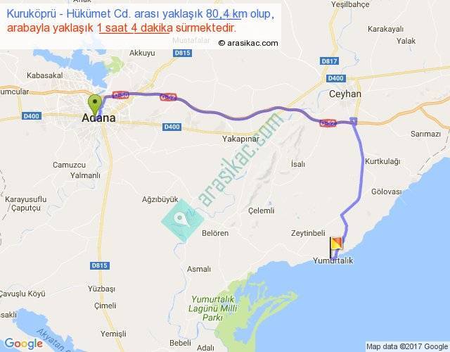 Kuruköprü - Hükümet Cd. arası yaklaşık olarak 90 km/h ile yukarıda belirtilen sürede olup, iki yerin kuş uçuşu uzaklığı (mesafesi) 47'dir. Yolculuk otobüsle 1 saat 23 dakika sürmektedir.