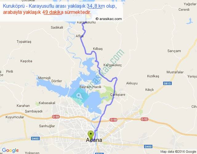 Kuruköprü - Karayusuflu arası yaklaşık olarak 90 km/h ile yukarıda belirtilen sürede olup, iki yerin kuş uçuşu uzaklığı (mesafesi) 24'dir. Yolculuk otobüsle 1 saat 3 dakika sürmektedir.