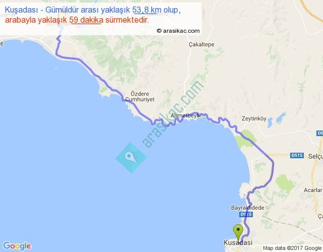 Kuşadası - Gümüldür arası yaklaşık olarak 90 km/h ile yukarıda belirtilen sürede olup, iki yerin kuş uçuşu uzaklığı (mesafesi) 34'dir. Yolculuk otobüsle 1 saat 16 dakika sürmektedir.
