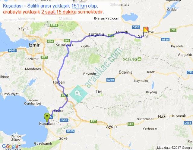 Kuşadası - Salihli arası yaklaşık olarak 90 km/h ile yukarıda belirtilen sürede olup, iki yerin kuş uçuşu uzaklığı (mesafesi) 103'dir. Yolculuk otobüsle 2 saat 55 dakika sürmektedir.