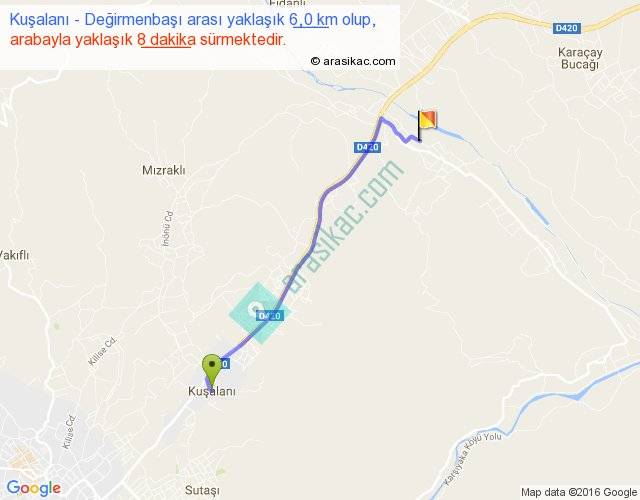 Kuşalanı - Değirmenbaşı arası yaklaşık olarak 90 km/h ile yukarıda belirtilen sürede olup, iki yerin kuş uçuşu uzaklığı (mesafesi) 5'dir. Yolculuk otobüsle 10 dakika sürmektedir.