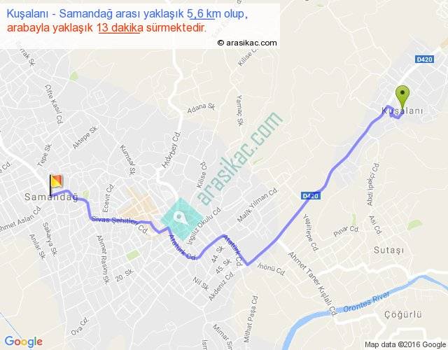 Kuşalanı - Samandağ arası yaklaşık olarak 90 km/h ile yukarıda belirtilen sürede olup, iki yerin kuş uçuşu uzaklığı (mesafesi) 4'dir. Yolculuk otobüsle 16 dakika sürmektedir.