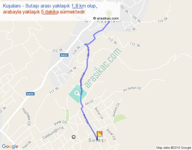 Kuşalanı - Sutaşı arası yaklaşık olarak 90 km/h ile yukarıda belirtilen sürede olup, iki yerin kuş uçuşu uzaklığı (mesafesi) 2'dir. Yolculuk otobüsle 6 dakika sürmektedir.