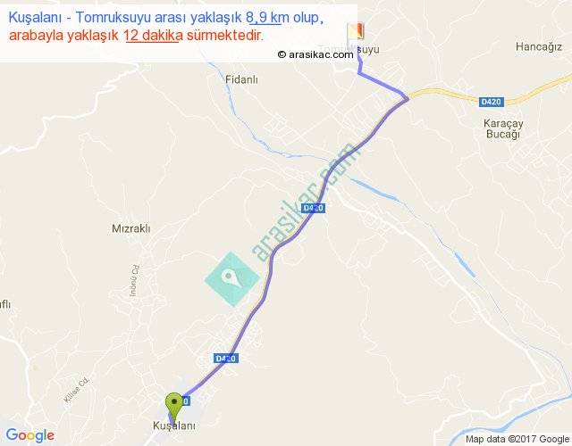 Kuşalanı - Tomruksuyu arası yaklaşık olarak 90 km/h ile yukarıda belirtilen sürede olup, iki yerin kuş uçuşu uzaklığı (mesafesi) 7'dir. Yolculuk otobüsle 15 dakika sürmektedir.