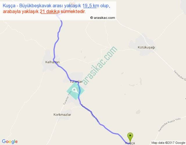 Kuşça - Büyükbeşkavak arası yaklaşık olarak 90 km/h ile yukarıda belirtilen sürede olup, iki yerin kuş uçuşu uzaklığı (mesafesi) 15'dir. Yolculuk otobüsle 27 dakika sürmektedir.