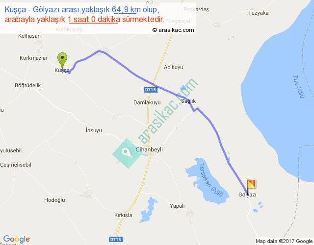 Kuşça - Gölyazı arası yaklaşık olarak 90 km/h ile yukarıda belirtilen sürede olup, iki yerin kuş uçuşu uzaklığı (mesafesi) 54'dir. Yolculuk otobüsle 1 saat 18 dakika sürmektedir.