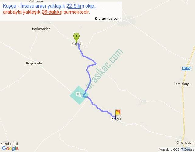 Kuşça - İnsuyu arası yaklaşık olarak 90 km/h ile yukarıda belirtilen sürede olup, iki yerin kuş uçuşu uzaklığı (mesafesi) 16'dir. Yolculuk otobüsle 33 dakika sürmektedir.
