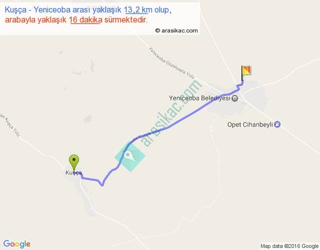 Kuşça - Yeniceoba arası yaklaşık olarak 90 km/h ile yukarıda belirtilen sürede olup, iki yerin kuş uçuşu uzaklığı (mesafesi) 11'dir. Yolculuk otobüsle 20 dakika sürmektedir.