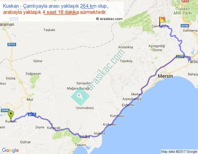 Kuskan - Çamlıyayla arası yaklaşık olarak 90 km/h ile yukarıda belirtilen sürede olup, iki yerin kuş uçuşu uzaklığı (mesafesi) 139'dir. Yolculuk otobüsle 5 saat 35 dakika sürmektedir.