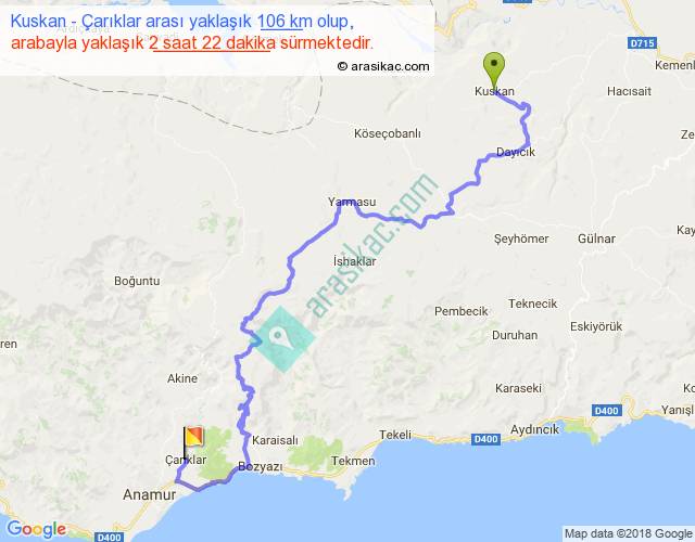 Kuskan - Çarıklar arası yaklaşık olarak 90 km/h ile yukarıda belirtilen sürede olup, iki yerin kuş uçuşu uzaklığı (mesafesi) 54'dir. Yolculuk otobüsle 3 saat 4 dakika sürmektedir.