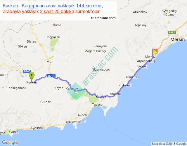 Kuskan - Kargıpınarı arası yaklaşık olarak 90 km/h ile yukarıda belirtilen sürede olup, iki yerin kuş uçuşu uzaklığı (mesafesi) 103'dir. Yolculuk otobüsle 3 saat 8 dakika sürmektedir.