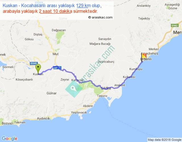 Kuskan - Kocahasanlı arası yaklaşık olarak 90 km/h ile yukarıda belirtilen sürede olup, iki yerin kuş uçuşu uzaklığı (mesafesi) 90'dir. Yolculuk otobüsle 2 saat 49 dakika sürmektedir.