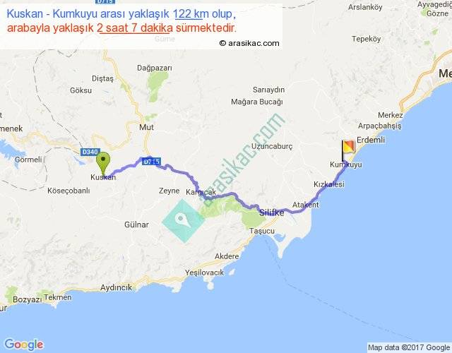Kuskan - Kumkuyu arası yaklaşık olarak 90 km/h ile yukarıda belirtilen sürede olup, iki yerin kuş uçuşu uzaklığı (mesafesi) 83'dir. Yolculuk otobüsle 2 saat 45 dakika sürmektedir.