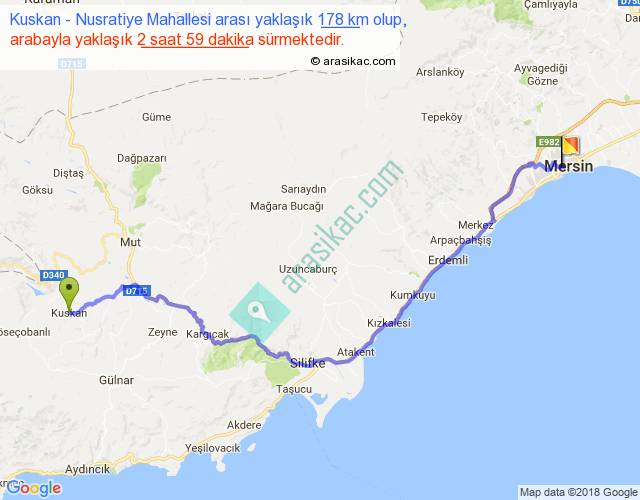 Kuskan - Nusratiye Mahallesi arası yaklaşık olarak 90 km/h ile yukarıda belirtilen sürede olup, iki yerin kuş uçuşu uzaklığı (mesafesi) 125'dir. Yolculuk otobüsle 3 saat 52 dakika sürmektedir.