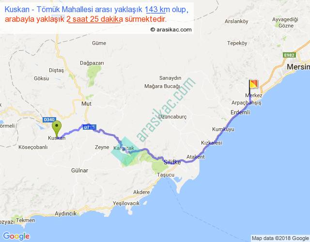 Kuskan - Tömük Mahallesi arası yaklaşık olarak 90 km/h ile yukarıda belirtilen sürede olup, iki yerin kuş uçuşu uzaklığı (mesafesi) 100'dir. Yolculuk otobüsle 3 saat 8 dakika sürmektedir.