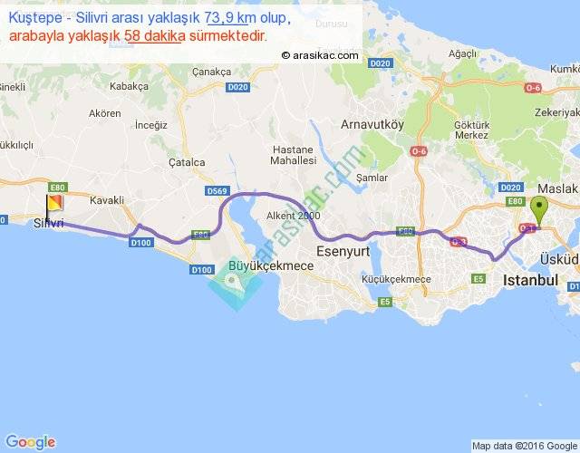 Kuştepe - Silivri arası yaklaşık olarak 90 km/h ile yukarıda belirtilen sürede olup, iki yerin kuş uçuşu uzaklığı (mesafesi) 62'dir. Yolculuk otobüsle 1 saat 15 dakika sürmektedir.
